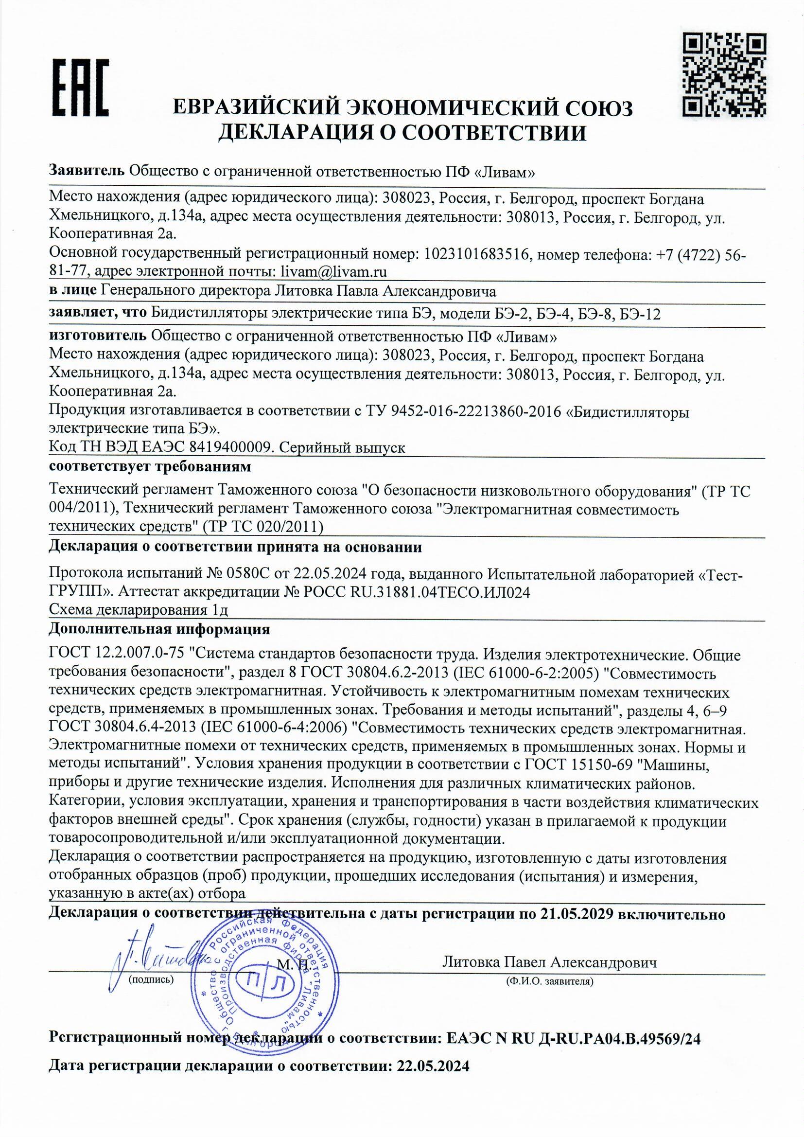 получение дистиллированной воды 2 типа согласно ГОСТ Р 58144-2018 «Вода дистиллированная», ФС.2.2.0019.18 «Вода для инъекций» |